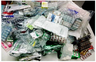 お年寄りに処方された薬。飲みきれず、大量に家に放置されていた =福井繁雄さん提供、薬局の袋部分に一部モザイクをかけています |