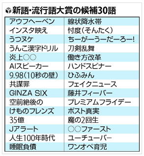| ちーがーうーだーろー!も候補に…新語・流行語 読売新聞の記事です。 今年話題になった言葉を選ぶ「2017ユーキャン新語・流行語大賞」(「現代用語の基礎知識」選)の候補30語が9日、発表された。 藤井聡太四段の活躍が目立った将棋界のほか、政治や芸能などに関する言葉がノミネートされた。 年間大賞とトップ10は12月1日に発表される。(以下、省略) 12月1日が楽しみです。 |