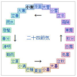 | 本日は小寒(しょうかん)です 昨日も朝から太陽が出て気温も上がり、春が来たような一日でした。 暖かかったので、屋上の菜園に水やりをしました。 このところ全く雨が降りませんでしたので、野菜の苗は喜んでくれたのではないかと思いました。 本日は小寒です。(下図参照) この日から節分(立春の前日)までを「寒(かん。寒中・寒の内とも)」と言い、この日を「寒の入り」とも言います。 暦の上では冬の寒さが一番厳しい時期となります。 この日から寒中見舞いを出し始めることになります。 |