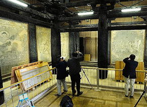 ![]() 収蔵庫内にたてられた焼損壁画と金堂の部材 =2015年11月、奈良県斑鳩町、遠藤真梨撮影 |