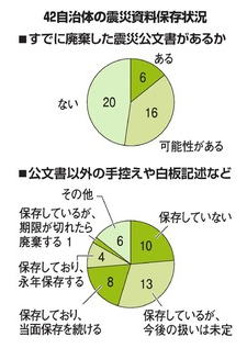 | 被災の記録、残らぬ恐れ 42市町村の過半数、既に廃棄も 朝日新聞の記事です。 東日本大震災で被災した岩手、宮城、福島各県の42市町村の過半数が、被災時の対応や復興の過程で作成した「震災公文書」の一部を既に廃棄したか、廃棄した可能性がある。 朝日新聞の調査で判明した。 当時のメモや写真なども10市町村が保存していなかった。(以下、省略) 本日朝刊の1面トップ記事です。 公文書の一部が破棄されたようです。 故意に破棄したのか、混乱の中誤って破棄したのかわかりませんが、今後の被災に対する教訓になったのではないでしょうか。 |