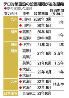 | テロ対策遅れ、原発停止へ 期限延長認めず 規制委方針 朝日新聞の記事です。 原子力規制委員会は24日、建設が遅れている原発のテロ対策施設について、設置期限に間に合わない原発に対し、運転停止を求める方針を確認した。 電力会社の求めていた期限延長などは認めなかった。 すでに再稼働した関西、四国、九州の3電力の5原発9基は、期限を迎える2020年以降に順次、運転停止を迫られる。(以下、省略) テロ対策施設の設置期限が迫る原発一覧が下の表にあります。 建設費は1基あたり500〜1200億円かかるようです。 この際、原発はゼロの方向で検討すべきではないでしょうか。 |