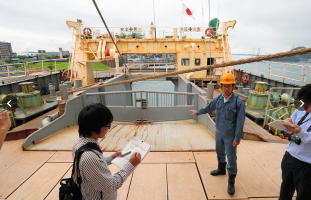 ![]() クジラを上甲板に引き揚げるスリップウェー =2019年6月30日午後、山口県下関市、金子淳撮影 |