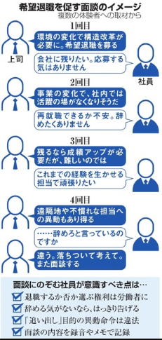| 名ばかり希望退職、対抗策は 面談内容の録音も一手 朝日新聞の記事です。 会社で突然、上司から「まかせたい仕事がない」と告げられ、自ら退職するよう促される――。 「希望退職」とは名ばかりの退職勧奨が、大企業で広がっています。 違法ではないのでしょうか。 電子部品子会社で約350人の削減を進める東芝。 同子会社に勤める50代男性は、上司から希望退職を何度も促されてきた。 「断っても、また面談を入れて応じるよう迫ってくる。こちらが折れるまで続けるつもりなのか」 男性が上司に呼ばれて最初に面談したのは6月上旬だった。 経営環境のきびしさを説明されたうえで、希望退職すれば退職金が増え、再就職支援会社のサービスも利用できると言われた。 「辞める気はありません」と告げると、上司は不思議がり、約1カ月後の再面談を約束させられた。(以下、省略) 何度も何度も退職を勧められると、「自分は会社の役に立っていないのだ」と考え最後には応じることになるようです。 会社のためにと思って真面目に働いてきた人ほど、衝撃は大きいのではないでしょうか。 退職を奨める人事担当者もいやな役目でしょう。 |