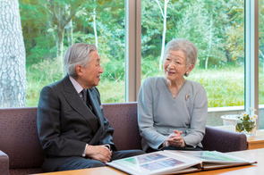 ![]() 代替わり後の一般参賀や天皇陛下の即位に関連した儀式の写真を前に笑顔で語り合う上皇ご夫妻 =2019年10月16日午後、吹上仙洞御所、宮内庁提供 |