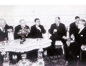 ![]() 1956年10月、モスクワで交渉する日ソ首脳らの昼食会前の様子。 左からフルシチョフ第1書記、ブルガーニン首相、河野一郎農相。右端は鳩山一郎首相 |