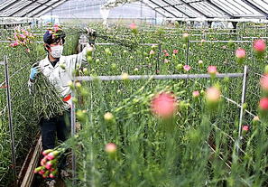 ![]() 温室でカーネーションを摘む鈴木直人さん =2020年5月4日午前、千葉県鋸南町、川村直子撮影 |