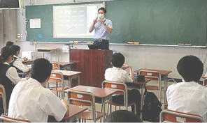 ![]() 黒板のスクリーンには、ウェブ会議システム「Zoom」で参加するクラスの半数が映る。 発言時以外は顔は表示しない(画像は一部加工しています) =3日、東京都台東区の都立白鴎高校付属中学校 |
