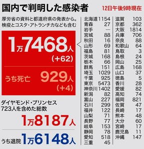 | 12日は全国で62人感染 東京ではホスト11人 朝日新聞の記事です。 新型コロナウイルスの国内感染者は12日午後9時現在、新たに62人が確認され、累計で1万7468人となった。 感染拡大への警戒を呼びかける「東京アラート」が11日に解除された都内は25人で、2日続けて指標(20人)を上回った。 死者は東京と神奈川県、福岡県で計4人増え、計929人となった。 都内の感染者25人のうち、感染経路がわからないのは7人。 接待を伴う飲食店などで感染したとみられる「夜の街」の関連は20〜30代の13人で、うち11人はホストという。 6〜12日に都が確認した感染者130人のうち、「夜の街」関連は51人。 6〜7割が新宿エリアという。(以下、省略) 依然、東京都の感染者が2桁で20人を超えております。 爆弾を抱えているようで、突然3桁になるのではないかと心配です。 本日もスポーツジムへ行く予定ですが、我慢してマスクをつけて頑張ります。 |