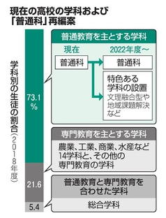 | 高校普通科の再編案提示 「必要性わかりにくい」指摘も 朝日新聞の記事です。 文部科学相の諮問機関・中央教育審議会の特別部会で17日、高校生の約7割が通う高校普通科の再編案が示された。 文系・理系の枠を超えた学びや地域社会の課題にとりくむ新学科の設置を可能にする案について議論し、中教審は2021年初めにも再編案などを文科相に答申する。 早ければ22年度から新学科の新設が認められる。(以下、省略) 総合学科ができたのも私は反対でした。 ましてや今回の高校の再編成には反対です。 総合学科を取りやめて、普通科高校と専門学科高校にすべきです。 |