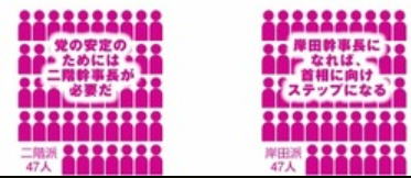 | 自民幹事長人事 二階氏VS.岸田氏、攻防最終章へ 朝日新聞の記事です。 昨年夏から秋にかけ、幹事長の座をめぐる暗闘が自民党内であった。 それからもうすぐ1年。 任期の最終盤に差し掛かった政権の浮沈につながりかねない争いが、また繰り返されようとしている。 「ポスト安倍」の行方にも絡み合うせめぎあいに、自民党の議員たちはこぞって目をこらす。(以下、省略) 下の画面にありますように、二階派も岸田派も47人です。 どのようになるかわかりませんが、二人が競い合っていることは事実です。 |