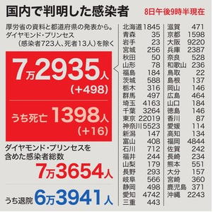 | イベント制限、19日にも緩和 5000人・定員50%内、見直し 政府検討 朝日新聞の記事です。 政府は8日、新型コロナウイルス感染症対策で9月末までとしているイベントの開催制限を緩和する検討に入った。 11日にも開く政府の分科会で専門家らの理解を得られれば、4連休初日の19日ごろから、前倒しで緩和したい考えだ。(以下、省略) 感染者が全国的に減少方向にありますので、良いのではないかと思います。 下の画像にありますが、全国で感染者が498人、東京は170人(全国の34.1%)でした。 死亡者が16人と、死亡者の多いのが気になります。 |