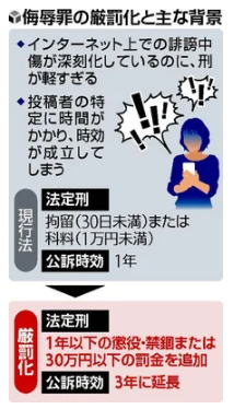 | ネット中傷に厳しい罰則、「侮辱罪」に懲役刑導入へ…テラハ事件では科料9千円だけ 読売新聞の記事です。 インターネット上での 誹謗ひぼう 中傷対策を強化するため、法務省は刑法の侮辱罪を厳罰化し、懲役刑を導入する方針を固めた。 来月中旬に開かれる法制審議会(法相の諮問機関)で同法改正を諮問する。 罰則の引き上げに伴い、公訴時効も1年から3年に延びる。 ネット上の投稿は加害者の特定に時間がかかり、摘発できないケースもあるが、法改正により、抑止効果や泣き寝入りの防止につながるとみられる。(以下、省略) 本日朝刊の1面トップ記事です。 誹謗中傷は、広がるごとに強い表現になりあてられた本人はたまったものではありません。 個人的な意見ですが、もっと厳しい罰則はできないものでしょうか。 |