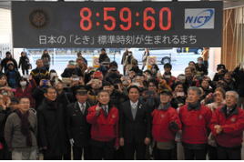 ![]() JR武蔵小金井駅でうるう秒の8時59分60秒が表示された時計を見上げる人たち =2017年1月1日、東京都小金井市、金居達朗撮影 |