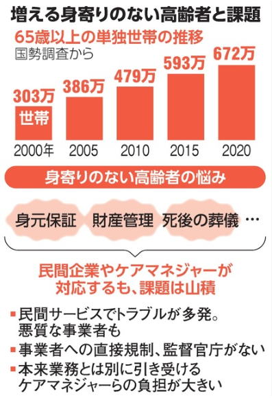 | 増える独り身高齢者、民間サービスでトラブル 政府が調査、対策検討 朝日新聞の記事です。 身寄りのない高齢者の増加に伴い、入院時の身元保証や葬儀などを一手に引き受ける民間サービスでトラブルが相次いでいる。 政府は法規制も視野に対策を検討するため、実態把握の調査に乗り出した。 ただ、民間の需要が増えるなかでの規制には課題も多そうだ。(以下、省略) 身寄りのない高齢者が増えているというニュースです。 当然のことですが、困った問題です。 |