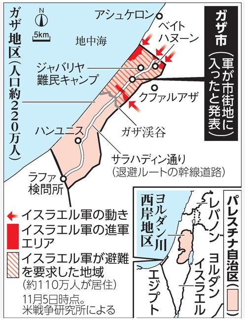 | ガザ、病院周辺へ攻撃頻発「集中治療室の患者負傷」 死者1万人超に 朝日新聞の記事です。 パレスチナ自治区ガザ地区をめぐる戦闘が激化し、ガザの死者数が1万人を超えた。 ガザを実効支配するイスラム組織ハマスの壊滅を掲げるイスラエルのネタニヤフ首相は5日、人質の解放なくして「停戦はない」と改めて強調。 軍はガザへの空爆を強め、中心都市ガザ市を包囲して市街地への侵攻を続けている。 ハマスのイスラエル攻撃から7日で1カ月になるが、停戦のめどはまったく立っていない。(以下、省略) 本日の新聞の1面のトップ記事です。 ガザ地区の攻撃は止まず、当分の間続くことでしょう。 平和な日本では考えられないことです。 |