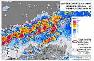 ![]() 10日午前0時15分現在の雨雲の状況。福岡県で線状降水帯が発生した=気象庁ウェブサイトから |