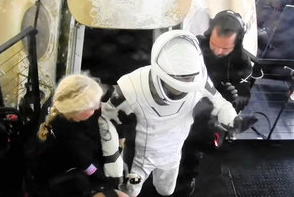 ![]() 米カリフォルニア沖に着水した宇宙船から出て、手を振る大西卓哉飛行士=NASAの中継映像から |
