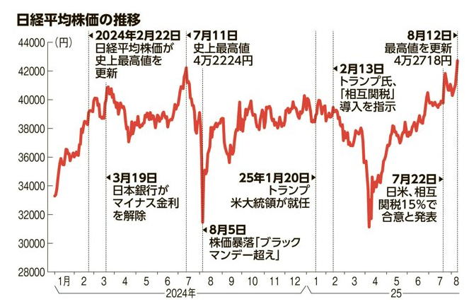 | 「トランプショック」半年 不透明感薄れ、日経平均最高値 死角は? 朝日新聞の記事です。 日経平均株価がほぼ1年ぶりに最高値を塗り替えた。 相場の重しとなっていた「トランプ関税」をめぐる不透明感が薄れ、堅調な企業業績も株価の上昇を支える。 ただ、米国経済の先行きに懸念はぬぐえず、市場が過熱していないか警戒感も漂っている。(以下、省略) 株価が最高値を記録しました。 そろそろ急降下するのではないでしょうか。 |