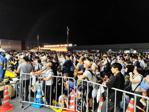 ![]() 夢洲駅の近くで滞留する来場者=大阪市此花区、魚住あかり撮影 |