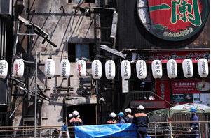 ![]() 現場検証をする消防隊員ら=2025年8月19日午前10時40分、大阪市中央区、有元愛美子撮影 |