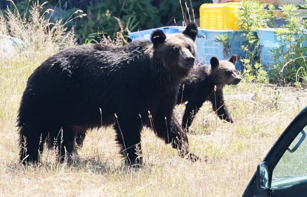 ![]() 文吉湾に現れた子連れのヒグマ=2025年7月13日、北海道斜里町、加藤丈朗撮影 |