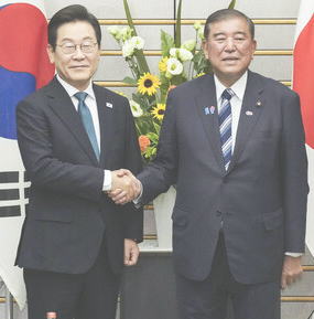 ![]() 韓国の李在明大統領(左)と握手する石破茂首相=23日午後5時59分、首相官邸、代表撮影 |