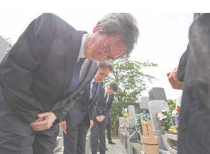 ![]() 亡くなった相嶋静夫さんの墓前で遺族に謝罪する(左から)最高検の小池隆公安部長、 東京地検の市川宏次席検事、警視庁の鎌田徹郎副総監 =2025年8月25日午前10時45分、横浜市の霊園、代表撮影 |