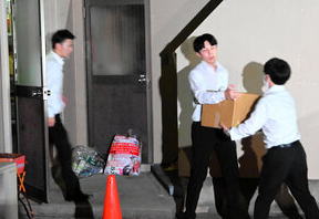 ![]() 押収品などを入れたとみられる段ボールを運び出す東京地検特捜部の係官ら =2025年8月27日午後7時6分、茨城県取手市片町の石井章参院議員の事務所、鹿野幹男撮影 |