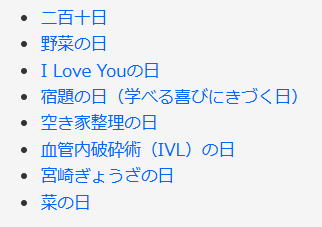 今日は何の日 (出典 雑学ネタ帳)![]() 二百十日(9月1日頃 雑節) 「二百十日(にひゃくとおか)」は、「雑節」の一つで、二十四節気「立春」(2月4日頃)を起算日として210日目(立春の209日後の日)にあたる。 その日付は年により変化し、近年では8月31日または9月1日となる。「立春」の変動により9月2日が「二百十日」となる場合もあるが、最も稀で、次に現れるのは2203年である。 「二百十日」の頃は、稲の開花期にあたる上に、台風の襲来する季節とも一致する。そのため、昔から農家では、220日目の雑節「二百二十日(にひゃくはつか)」とともに災難が起こる「厄日(やくび)」として警戒される。 ![]() 台風 「二百十日」や「二百二十日」は台風が襲来することの多い「特異日」ともされるが、統計的に必ずしも「台風の多い日」または「風の強い日」ではない。 「二百十日」が暦に記載されるようになったのは比較的新しく、江戸時代の初期以後のことである。これは上記のように農家に注意を促すことが目的であった。 また、この日の前後には、風害を免れるよう祈願して、各地の神社で風祭(かざまつり)や風鎮祭(ふうちんさい)などの祭りが催されてきた。 |