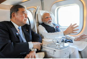 ![]() 東京から仙台に新幹線で移動するインドのモディ首相(右)と石破茂首相 =2025年8月30日、内閣広報室提供 |