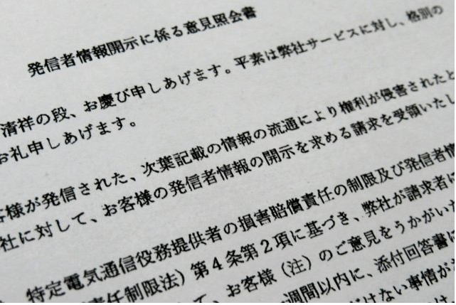 ![]() インターネットプロバイダーから送られる「意見照会書」の例 |