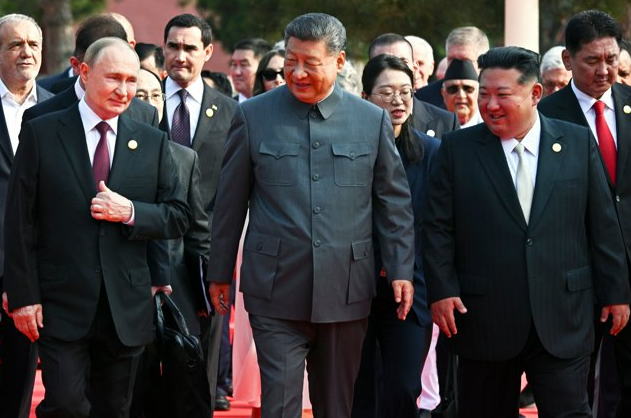 ![]() 2025年9月3日、北京での軍事パレードに出席する、中国の習近平国家主席(中央)と ロシアのプーチン大統領(左隣)、北朝鮮の金正恩総書記(右隣) |
