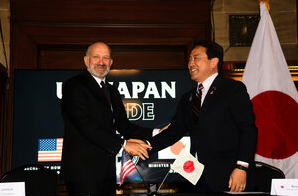 ![]() 握手するラトニック米商務長官(左)と赤沢亮正経済再生相=2025年9月4日、ワシントンの商務省、榊原謙撮 |
