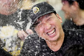 ![]() セ・リーグ優勝を決め、ビールかけで笑顔を見せる阪神の藤川球児監督=米田怜央撮影 |