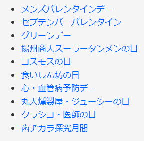 今日は何の日 (出典 雑学ネタ帳)![]() メンズバレンタインデー(9月14日 記念日) 東京都中央区日本橋富沢町に事務局を置き、女性用インナーウェアとナイトウェアのメーカー団体である一般社団法人「日本ボディファッション協会」(NBF)が1991年(平成3年)に制定。 女性から男性にチョコレートを贈る2月14日の「バレンタインデー」に対して、男性から女性に下着を贈って愛を告白する日。日付は3月14日の「ホワイトデー」の半年後であることから。同協会では現在は特にイベントなどを実施していないようである。 ![]() 日本ボディファッション協会 日本ボディファッション協会について 同協会は、1960年(昭和35年)に「ブラジャー・コルセット・アンダーウエア協会」として設立されたのが始まりである。ファンデーション・ランジェリー・アンダーウェア・ナイトウェアなどの生産・流通・消費の改善・合理化を図り、豊かな衣生活と関連産業の健全な発展を目的としている。 同協会では、独自に業界としても高水準の品質基準を設け、この基準に合格した製品のみに「NBFロゴマーク」の使用を許可している。このマークの保証するところは、単に製品の物性面の品質のみならず、企業としての法令遵守、環境保護に鋭意努力する姿勢にも及んでいる。 ![]() |
