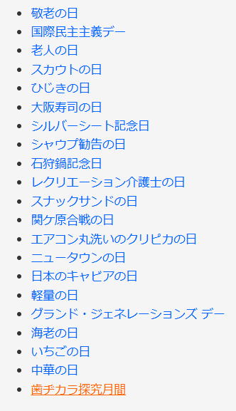 今日は何の日 (出典 雑学ネタ帳)![]() 敬老の日(9月第3月曜日 国民の祝日) 「国民の祝日」の一つ。「多年にわたり社会につくしてきた老人を敬愛し、長寿を祝う」ことを趣旨としている。 ![]() 国民の祝日 「敬老の日」は、兵庫県多可郡野間谷村(現:多可町八千代区)の門脇政夫村長が提唱した「としよりの日」が始まりである。 「老人を大切にし、年寄りの知恵を借りて村作りをしよう」と、1947年(昭和22年)から、農閑期に当たり気候も良い9月中旬の15日を「としよりの日」と定め、「敬老会」を開いた。1950年(昭和25年)からは兵庫県全体で行われるようになり、それが全国に広がった。 ![]() 敬老の日 その後、1966年(昭和41年)に国民の祝日として9月15日が「敬老の日」に制定された。 9月15日という日付については、聖徳太子が四天王寺に悲田院を建立した日や、元正天皇が養老の滝に御幸された日などの俗説もあるが、どちらも確かではない。 2002年(平成14年)までは9月15日を「敬老の日」としていたが、「祝日法」の改正でハッピーマンデー制度が実施され、2003年(平成15年)からは9月の第3月曜日となった。 「敬老の日」の日付は以下の通り。 2016年9月19日(月) 2017年9月18日(月) 2018年9月17日(月) 2019年9月16日(月) 2020年9月21日(月) 2021年9月20日(月) 2022年9月19日(月) 2023年9月18日(月) 2024年9月16日(月) 2025年9月15日(月) この日には、自治会や町内会、老人福祉施設などで高齢者の長寿を祝う行事として、高齢者による踊りや演奏の披露、子ども達との交流会などが開催される。また、家族や親族が集まって食事会をしたり、日頃の感謝の気持ちを込めて祖父・祖母にプレゼントを贈ったりする。 ![]() 老人を中心とした家族 「敬老の日」と同様の趣旨の記念日として、「老人福祉法」によって定められた、9月15日の「老人の日」、9月15日〜21日の「老人週間」がある。 また、「敬老の日」にちなんだ記念日は数多くあり、「心・血管病予防デー」「グランド・ジェネレーションズ デー」「海老の日」「まごの日」「ひじきの日」「シルバーシート記念日」「レクリエーション介護士の日」がある。 |