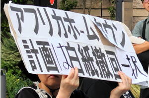 ![]() 国際協力機構(JICA)が認定したアフリカホームタウンに反対するデモでは、 撤回を求めるプラカードを掲げる人もいた =2025年8月28日午後5時34分、東京都千代田区、山本知佳撮影 |