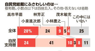 | 自民党総裁にふさわしいのは 高市氏28%、小泉氏24% 朝日新聞の記事です。 朝日新聞社は20、21の両日、全国世論調査(電話)を実施した。 新しい自民党総裁に誰がふさわしいと思うか聞いたところ、高市早苗・前経済安全保障相が28%、小泉進次郎・農林水産相が24%で続いた。 自民支持層に限ると、小泉氏が41%、高市氏が24%となり順位が入れ替わった。(以下、省略) 本日の新聞の1面のトップ記事です。 本日公示されますが、5人の立候補となります。 果たして誰が総裁になるのでしょうか。 |