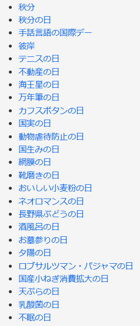今日は何の日 (出典 雑学ネタ帳)![]() ![]() 秋分(9月23日頃 二十四節気) 「秋分(しゅうぶん)」は、「二十四節気」の一つで第16番目にあたる。英語では「autumnal equinox」。 現在広まっている定気法では、太陽が秋分点を通過した瞬間、すなわち太陽黄経が180度となったときで、近年では9月22日または9月23日となる。2025年(令和7年)は9月23日(火)である。 「秋分」の一つ前の節気は「白露」(9月8日頃)、一つ後の節気は「寒露」(10月8日頃)。「秋分」には期間としての意味もあり、この日から、次の節気の「寒露」前日までである。西洋占星術では「秋分」が天秤宮(てんびんきゅう:てんびん座)の始まりとなる。 ![]() いわし雲が浮かぶ秋の空 昼と夜の長さがほぼ同じ(実際は昼の方が若干長い)になる日で、「春分」(3月21日頃)と同じように太陽が真東から出て真西に沈む。江戸時代の暦の解説書『こよみ便覧(べんらん)』では「陰陽の中分なれば也」と説明している。 「秋分」の日付は以下の通り。 2016年9月22日(木) 2017年9月23日(土) 2018年9月23日(日) 2019年9月23日(月) 2020年9月22日(火) 2021年9月23日(木) 2022年9月23日(金) 2023年9月23日(土) 2024年9月22日(日) 2025年9月23日(火) 日本ではこの日は国民の祝日「秋分の日」となる。秋分の日は、国立天文台の算出する定気法による秋分日を基にして閣議決定され、前年2月1日に暦要項として官報に告示される。天文学に基づいて年ごとに決定される国家の祝日は世界的にみても珍しい。また、秋の彼岸の中日でもある。 |