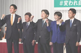 ![]() 自民党総裁選の所見発表演説会を終え、写真撮影に臨む(右から)小泉進次郎農水相、高市早苗前経済安保相、林芳正官房長官、茂木敏充前幹事長、小林鷹之元経済安保相 =2025年9月22日午後2時18分、東京・永田町の党本部、岩下毅撮影 |