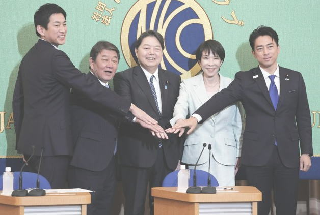 ![]() 討論会に臨む(左から)小林鷹之・元経済安保相、茂木敏充・前幹事長、林芳正・官房長官、 高市早苗・前経済安保相と小泉進次郎・農林水産相 =2025年9月24日午後0時56分、東京都千代田区、竹花徹朗撮影 |