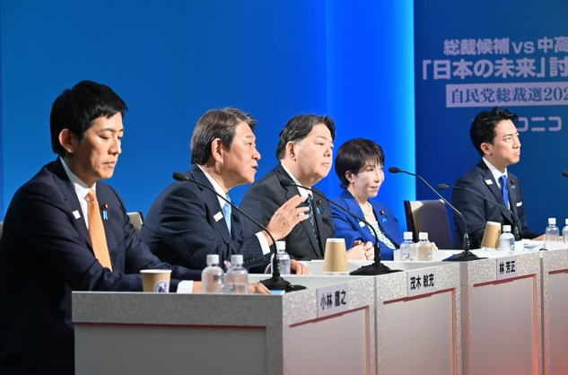 ![]() 討論会に臨む自民党総裁選の候補者たち=2025年9月28日午後7時15分、東京都中央区、筋野健太撮影 |
