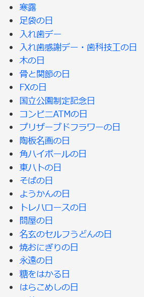 今日は何の日 (出典 雑学ネタ帳)![]() ![]() 寒露(10月8日頃 二十四節気) 「寒露(かんろ)」は、「二十四節気」の一つで第17番目にあたる。現在広まっている定気法では太陽黄経が195度のときで10月8日頃。 「寒露」の日付は、近年では10月8日または10月9日であり、年によって異なる。2025年(令和7年)は10月8日(水)である。 「寒露」の一つ前の節気は「秋分」(9月23日頃)、一つ後の節気は「霜降」(10月23日頃)。「寒露」には期間としての意味もあり、この日から、次の節気の「霜降」前日までである。 露が冷たく感じられる頃、冷たい露が野草に付く頃という意味で「寒露」とされる。また、露が冷気によって凍りそうになる頃。江戸時代の暦の解説書『こよみ便覧(べんらん)』では、「陰寒の気に合つて露結び凝らんとすれば也」と説明している。 ![]() 素敵な鳴き声のコオロギ この時期は、雁(ガン)や鶇(ツグミ)などの冬鳥が渡ってきて、菊(キク)が咲き始め、蟋蟀(コオロギ)などが鳴き始める頃でもある。また、秋が深まり、紅葉が色鮮やかになり見頃となる。農家では稲など農作物の収穫の時期を迎える。 |