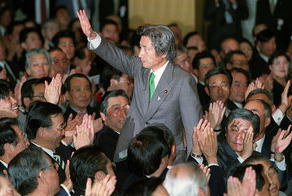 ![]() 2001年の自民党総裁選で新総裁に選ばれ、拍手にこたえる小泉純一郎氏=党本部 |