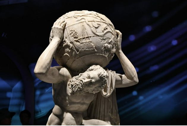 ![]() 展示されるファルネーゼのアトラス =2025年10月10日午後1時1分、大阪市此花区の夢洲、水野義則撮影 |
