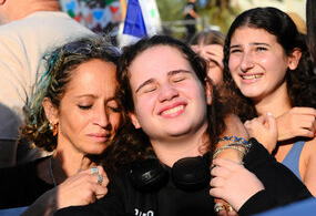 ![]() イスラム組織ハマスが人質を解放したと伝えるテレビ中継を見て喜ぶ人たち =2025年10月13日、イスラエルのテルアビブ、真野啓太撮影 |