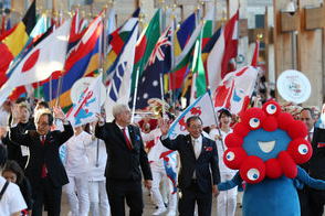 ![]() 大屋根リングの下を行進するミャクミャクと日本国際博覧会協会の十倉雅和会長(左から3人目)ら =2025年10月13日午後4時45分、大阪市此花区、有元愛美子撮影 |