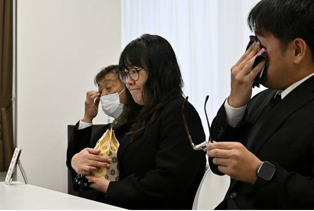 ![]() 受け取った山根捺星さんの遺骨を大事に抱える母親の千弓さん(中央)。 左は父親の朋紀さん、右は兄の大弥さん =2025年10月16日午後1時34分、宮城県南三陸町志津川、福留庸友撮影 |