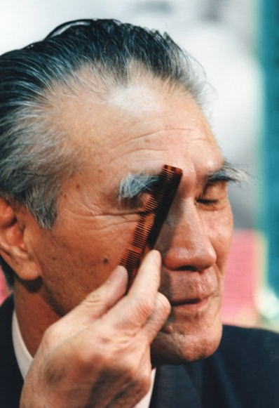 ![]() トレードマークの眉毛の手入れをする村山富市首相=1994年、羽後栄撮影 |